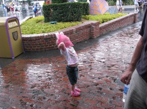It rained every day, but most times it was just a drizzle, or a short shower and then on with the show. We were at Animal Kingdom the second day, and when it started to rain, you would have thought we were the only ones there. People simply disappeared. We were walking down the street – I mean, come on people, it’s just a drizzle, even the baby in her stroller didn’t seem to notice it – and it was practically empty. That was in the top ten of my favorite parts of vacation, that empty street. As soon as it stopped, there seemed to be twice as many people as before. My nephews tell me that it rains every day in Florida, but I didn’t remember that from last year.