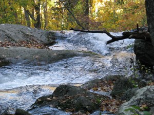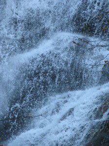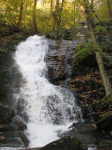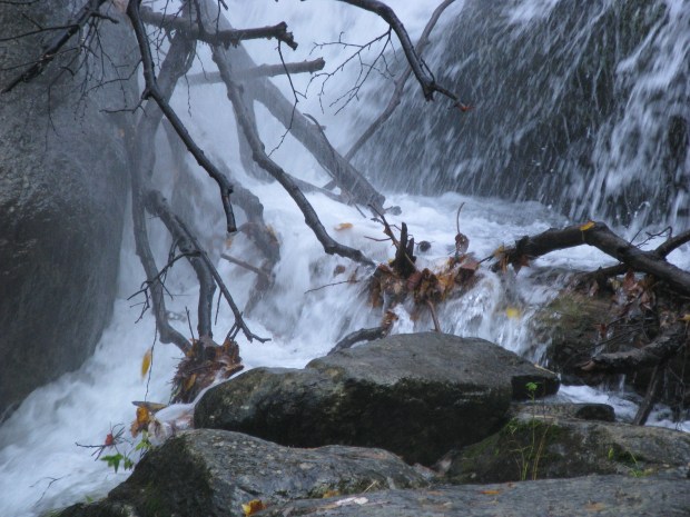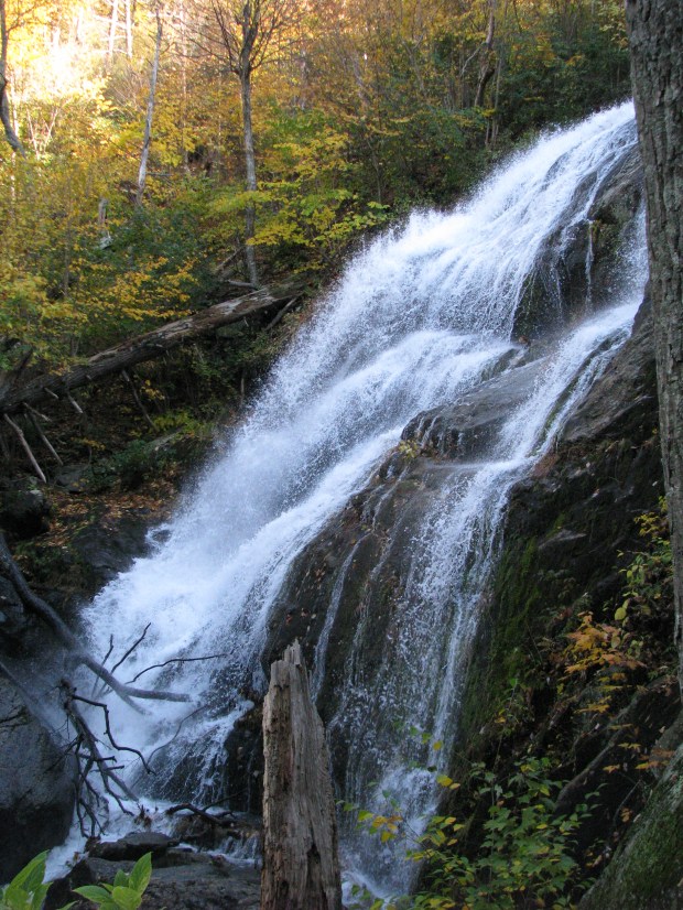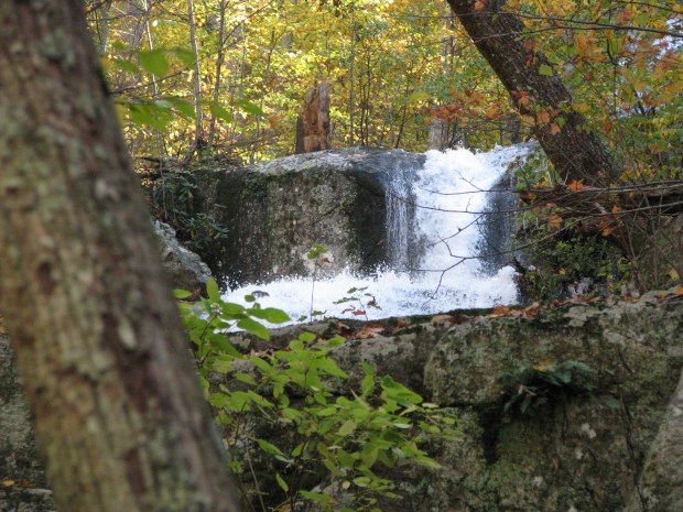 This isn’t a waterfall. But I thought it was pretty interesting just the same. You can see, through the layers of trees, what Fall has been looking like here in Virginia. In this one shot, we’ve got a bare tree in the foreground, a bright yellow tree in the middle, and a green hill in the background.
